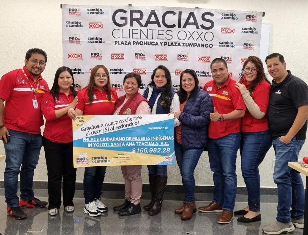 Entrega del cheque de REDONDEO a Enlace Ciudadano de Mujeres Indígenas In Yolotl Santa Ana Tzacuala AC recaudando la cantidad de $156,982.28. Agradecemos a todos los clientes de Oxxo por su redondeo que hara posible el centro dental comunitario.